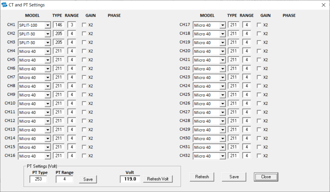 If it succeeds, it should show Status: Connected. In the menu bar, click CT and PT Settings. In the window that opens, configure the CT types for each channel then click Save.